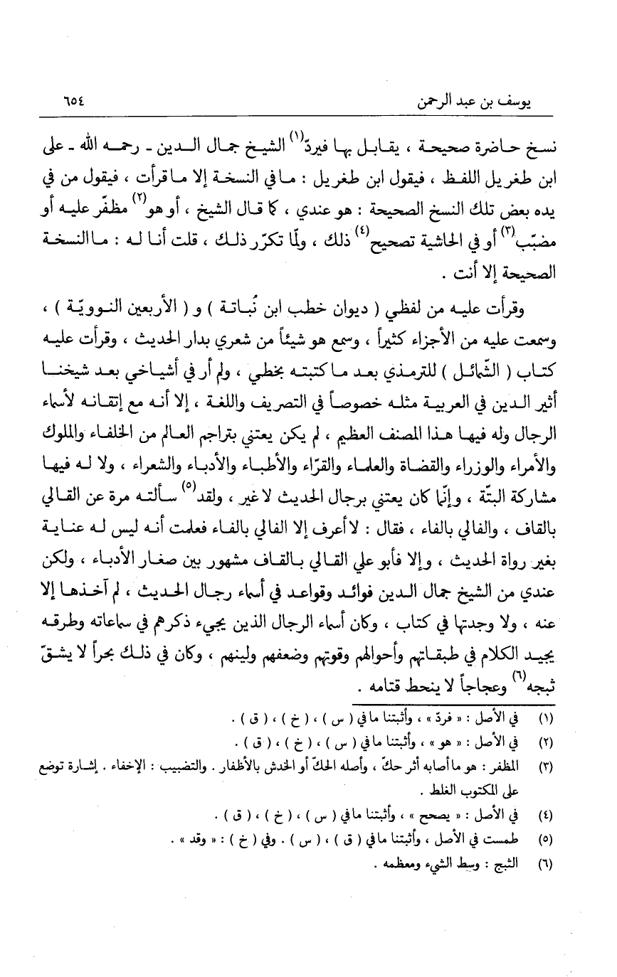 نسخ حاضرة صحيحة، يقابل بها فيردّ الشيخ جمال الدين - رحمه الله - على ابن طغريل اللفظ، فيقول ابن طغريل: ما في النسخة إلا ما قرأت، فيقول من في يده بعض تلك النسخ الصحيحة: هو عندي، كما قال الشيخ، أو هو مظفّر عليه أو مضبّب أو في الحاشية تصحيح ذلك، ولما تكرر ذلك، قلت أنا له: ما النسخة الصحيحة إلا أنت.