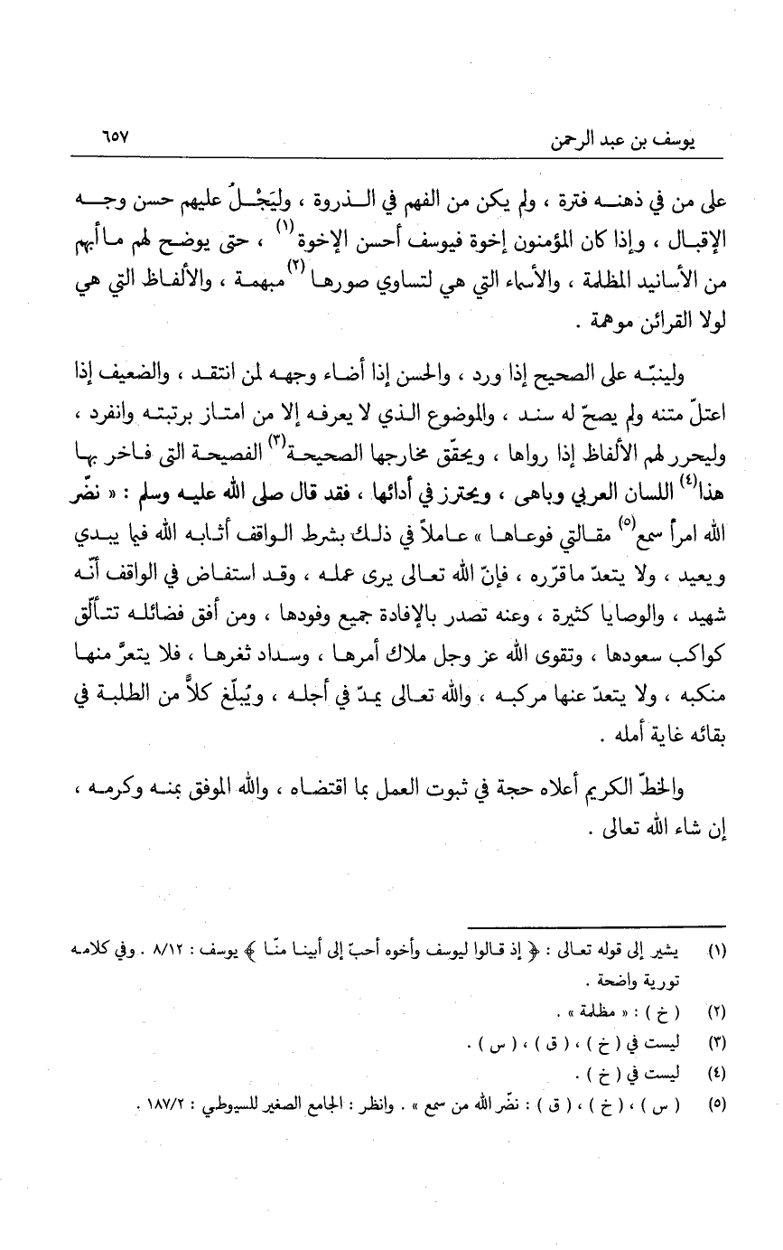 على من في ذهنه فترة، ولم يكن من الفهم في الذروة، وليجْلُ عليهم حسن وجه الإقبال، وإذا كان المؤمنون إخوة فيوسف أحسن الإخوة، حتى يوضح لهم ما أبهم من الأسانيد المظلمة، والأسماء التي هي لتساوي صورها مبهمة، والألفاظ التي هي لولا القرائن موهمة.