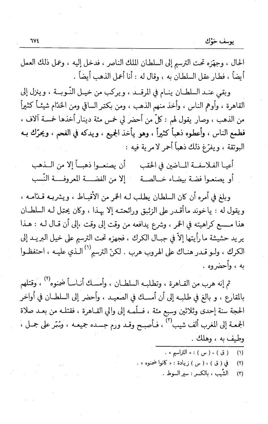 وبلغ في أمره أن كان السلطان يطلب له الخمر من الأقباط، ويشربه قدّامه، ويقول له: يا خوند ما أقدر على الزئبق ورائحته إلا بهذا، وكان يحتمل له السلطان هذا مع كراهيته في الخمر، وشرع يدافعه من وقت الى وقت، الى أن قال له: هذا يريد حشيشة ما رأيتها إلا في جبال الكرك، فجهزه تحت الترسيم على خيل البريد الى الكرك، ولو قدر هناك على الهروب هرب. لكن الترسيم الذي عليه، احتفظوا به، وأحضروه.