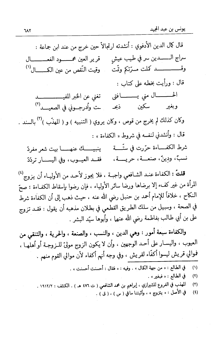 قال: وأنشدني لنفسه في شروط الكفاءة: