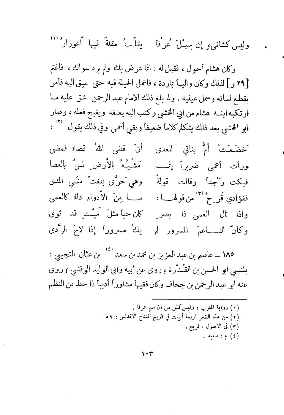 وليس كشانئ إن سيل عرفاً ... (1) يقلب مقلة فيها اعورار وكان هشام أحول، فقيل له: إنما عرض بك ولم يرد سواك، فاغتنم [29 و] لذلك وكان والياً بماردة، فأعمل الحيلة فيه حتى سيق إليه فأمر بقطع لسانه وسمل عينيه. ولما بلغ ذلك الإمام عبد الرحمن شق عليه ما ارتكبه ابنه هشام من أبي المخشي وكتب إليه يعنفه ويقبح فعله، وصار أبو المخشي بعد ذلك يتكلم كلاماً ضعيفاً وبقي أعمى وفي ذلك يقول (2) :