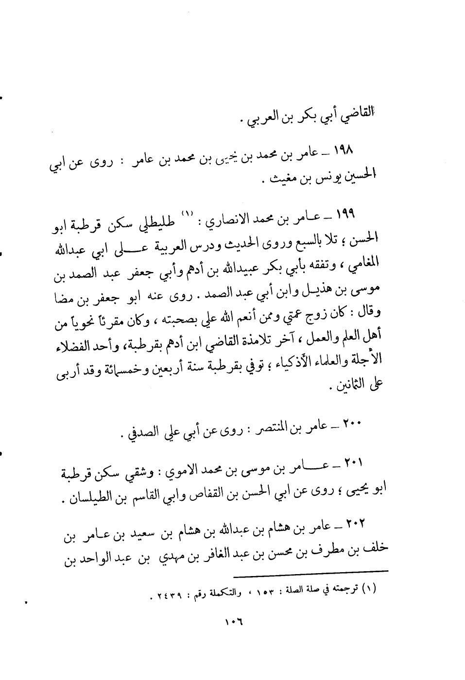 199 - عامر بن محمد الأنصاري: (1) طليطلي سكن قرطبة أبو الحسن؛ تلا بالسبع وروى الحديث ودرس العربية على أبي عبد الله المغامي، وتفقه بأبي بكر عبيد الله بن أدهم وأبي جعفر عبد الصمد بن موسى بن هذيل وابن أبي عبد الصمد. روى عنه أبو جعفر بن مضا وقال: كان زوج عمتي وممن انعم الله علي بصحبته، وكان مقرئاً نحوياً من أهل العلم والعمل، آخر تلامذة القاضي ابن أدهم بقرطبة، وأحد الفضلاء الأجلة والعلماء الأذكياء؛ توفي بقرطبة سنة أربعين وخمسمائة وقد أربى على الثمانين.