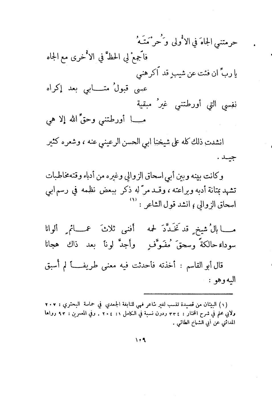 (1) البيتان من قصيدة تنسب لغير شاعر فهي للنابغة الجعدي في حماسة البحتري: 207 ولأبي محلم في شرح المختار: 334 ودون نسبة في الكامل 1: 204. وفي المعمرين: 93 رواها المدائني عن أبي الشماخ الطائي.
