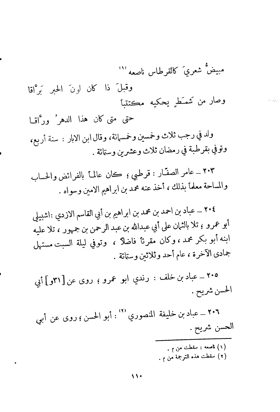 203 - عامر الصفار: قرطبي؛ كان عالماً بالفرائض والحساب والمساحة معلماً بذلك، أخذ عنه محمد بن إبراهيم الأمين وسواه.