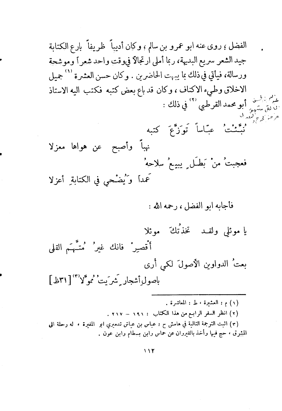 الفضل؛ روى عنه أبو عمرو بن سالم، وكان أديباً ظريفاً بارع الكتابة جيد الشعر سريع البديهة، ربما أملى إرتجالاً في وقت واحد شعراً وموشحة ورسالة، فيأتي في ذلك ما يبهت الحاضرين. وكان حسن العشرة (1) جميل الأخلاق وطيء الأكناف، وكان قد باع بعض كتبه فكتب إليه الأستاذ أبو محمد القرطبي (2) في ذلك: