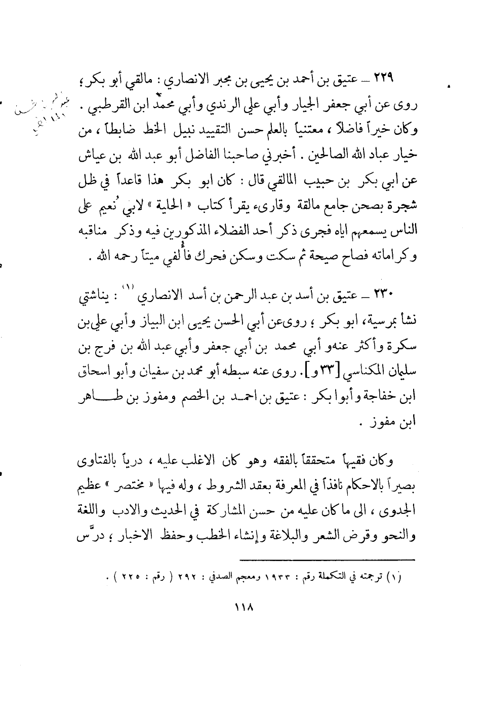 229 - عتيق بن أحمد بن يحيى بن مجبر الأنصاري: مالقي أبو بكر؛ روى عن أبي جعفر الجيار وأبي علي الرندي وأبي محمد ابن القرطبي. وكان خيراً فاضلاً، معتنياً بالعلم حسن التقييد نبيل الخط ضابطاً، من خيار عباد الله الصالحين. أخبروني صاحبنا الفاضل أبو عبد الله بن عياش عن أبي بكر بن حبيب المالقي قال: كان أبو بكر هذا قاعداً في ظل شجرة بصحن جامع مالقة وقارئ يقرأ كتاب " الحلية " لابي نعيم على الناس يسمعهم إياه فجري ذكر أحد الفضلاء المذكورين فيه وذكر مناقبه وكراماته فصاح صيحة ثم سكت وسكن فحرك فالفي ميتاً رحمه الله.