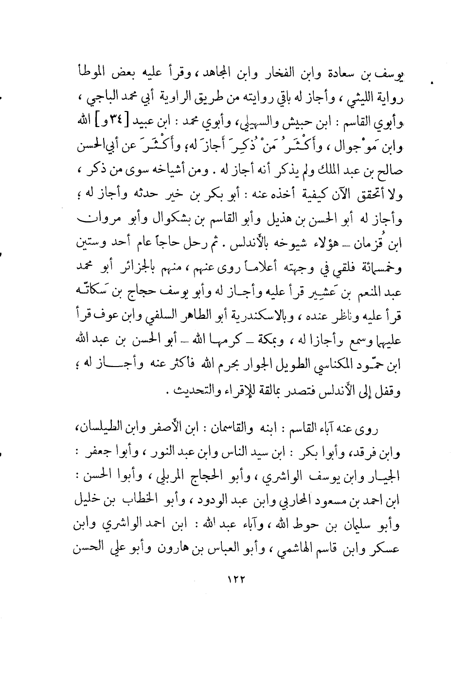 يوسف بن سعادة وأبن الفخار وأبن مجاهد، وقرأ عليه بعض الموطأ رواية الليثي، وأجاز له باقي روايته من طريق الراوية أبي محمد الباجي، وأبوي القاسم: أبن حبيش والسهيلي، وأبوي محمد: أبن عبيد [34 و] الله وأبن موجوال، وكثر من ذكر أجاز له؛ وأكثر عن أبي الحسن صالح بن عبد الملك ولم يذكر أنه أجاز له. ومن أشياخه سوى من ذكر، ولا أتحقق الآن كيفية أخذه عنه: أبو بكر بن خير حدثه وأجاز له؛ وأجاز له أبو الحسن بن هذيل وأبو القاسم بن بشكوال وأبو مروان أبن قزمان - هؤلاء شيوخه بالأندلس. ثم رحل حاجاً عام أحد وستين وخمسمائة فلقي في وجهته أعلاماً روى عنهم، منهم بالجزائر أبو محمد عبد المنعم بن عشير قرأ عليه وأجاز له وأبو يوسف حجاج بن سكاته قرأ عليه وناظر عنده، وبالإسكندرية أبو الطاهر السلفي وأبن عوف قرأ عليهما وسمع وأجازا له، وبمكة - كرمها الله - أبو الحسن بن عبد الله أبن حمود المكناسي الطويل الجوار بحرم الله فأكثر عنه وأجاز له؛ وقفل إلى الأندلس فتصدر بمالقة للإقراء والتحديث.