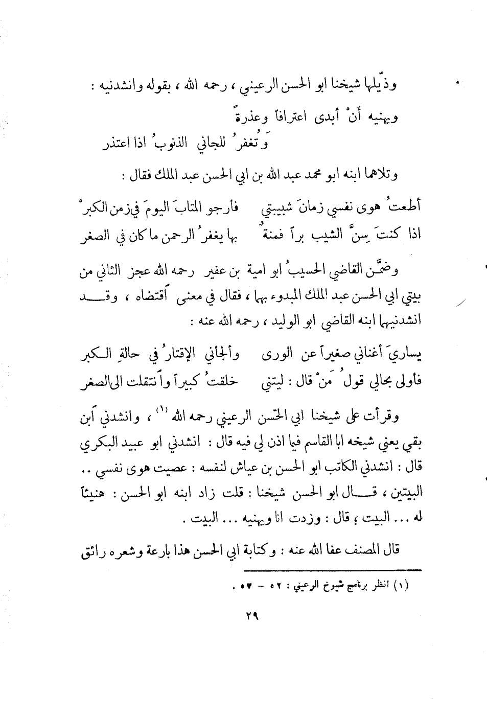 فأولى بحالي قول من قال: ليتني ... خلقت كبيراً وانتقلت إلى الصغر وقرأت على شيخنا أبي الحسن الرعيني رحمه الله (1) ، وأنشدني ابن بقي يعني شيخه أبا القاسم فيما أذن لي فيه قال: أنشدني أبو عبيد البكري قال: أنشدني الكاتب أبو الحسن بن عياش لنفسه: عصيت هوى نفسي.. البتين، قال أبو الحسن شيخنا: قلت زاد ابنه أبو الحسن: هنيئاً له؟ البيت؛ قال: وزدت انا ويهنيه؟ البيت.