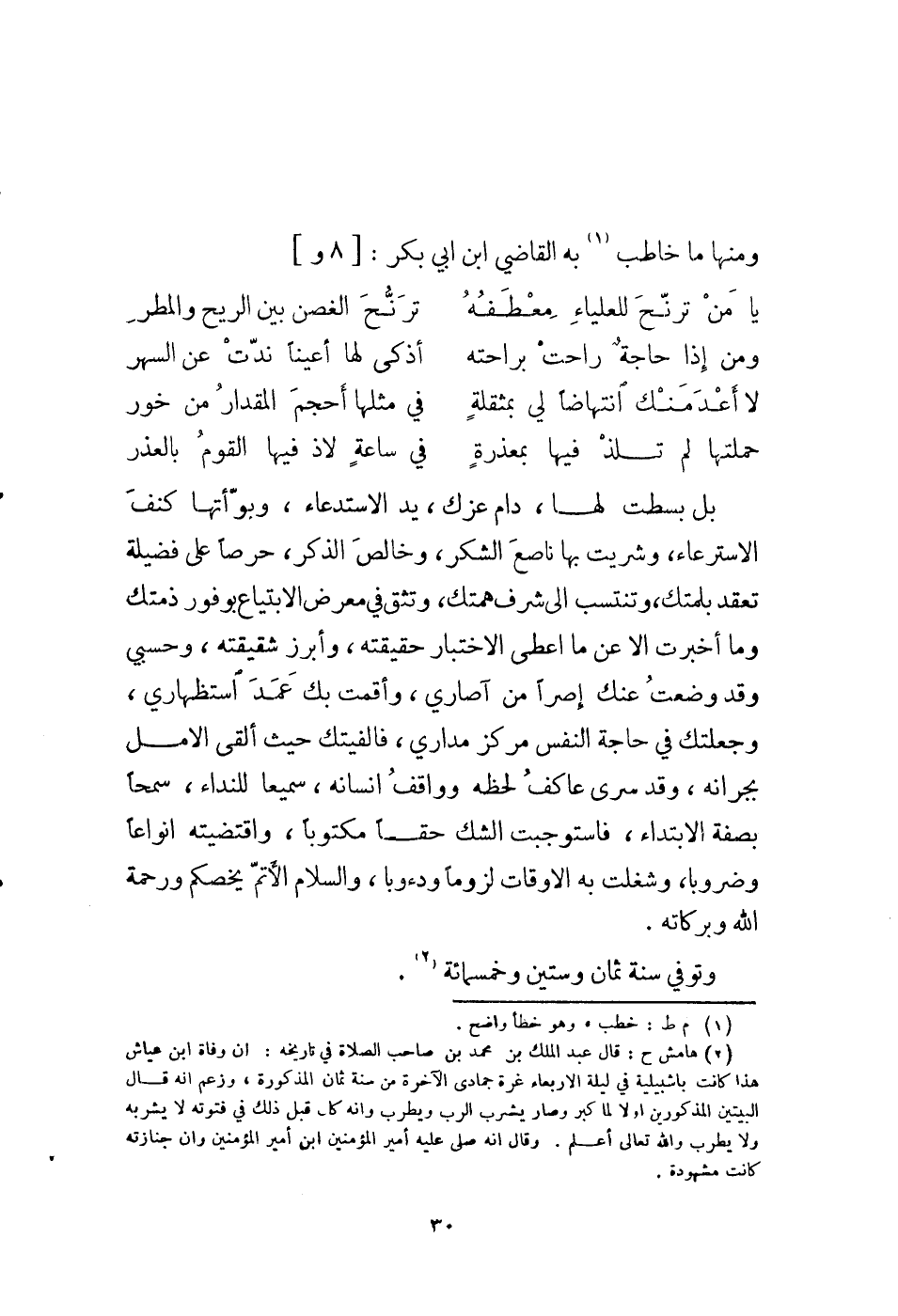 حملتها لم تلذ فيها بمعذرة ... في ساعة لاذ فيها القوم بالعذر بل بسطت لها، دام عزك، يد الاستدعاء، وبوأتها كنف الاسترعاء، وشريت بها ناصع الشكر، وخالص الذكر، حرصاً على فضيلة تعقد بلمتك، وتنتسب إلى شرف همتك، وتثق في معرض الابتياع بوفور ذمتك وما أخبرت إلا عن ما أعطى الاختبار حقيقته، وأبرز شقيقته، وحسبي وقد وضعت عنك إصراً من آصاري، وأقمت بك عمد استظهاري، وجعلتك في حاجة النفس مركز مداري، فألفيتك حيث ألقى الأمل بجرانه، وقد سرى عاكف لحظه وواقف انسانه، سميعا للنداء، سمحاً بصفة الابتداء، فاستوجبت الشك حقاً مكتوباً، واقتضيته أنواعاً وضروباً، وشغلت به الأوقات لزوماً ودءوبا، والسلام الاتم يخصكم ورحمة الله وبركاته.