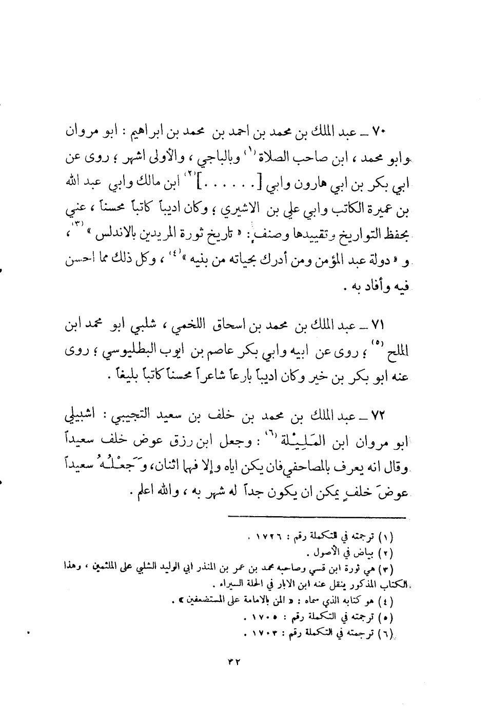 70 - عبد الملك بن محمد بن أحمد بن محمد بن إبراهيم: أبو مروا وأبو محمد، ابن صاحب الصلاة (1) وبالباجي، والأولى أشهر؛ روى عن أبي بكر بن أبي هارون وأبي [؟.] (2) ابن مالك وأبي عبد الله بن عميرة الكاتب وأبي بن الاشيري؛ وكان أديباً كاتباً محسناً، عني بحفظ التواريخ وتقييدها وصنف: " تاريخ ثورة المريدين بالأندلس " (3) ، و " دولة عبد المؤمن ومن أدراك بحياته من بنيه " (4) وكل ذلك مما أحسن فيه وأفاد به.