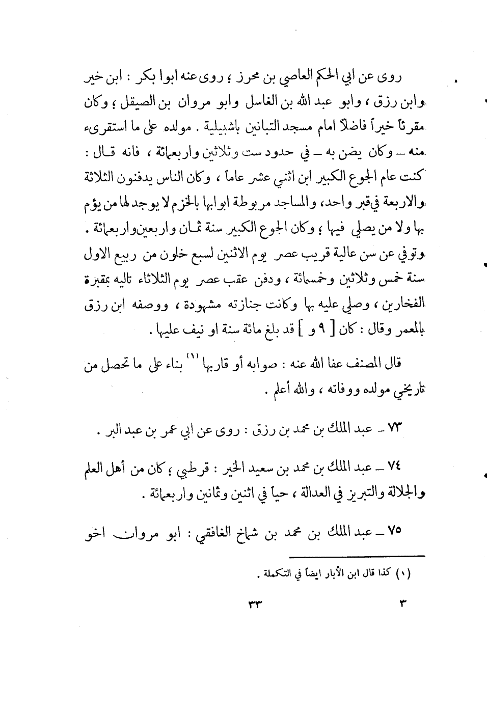 74 - عبد الملك بن محمد بن سعيد الخير: قرطبي؛ كان من أهل العلم والجلالة والتبريز في العدالة، حياً في اثنين وثمانين واربعمائة.