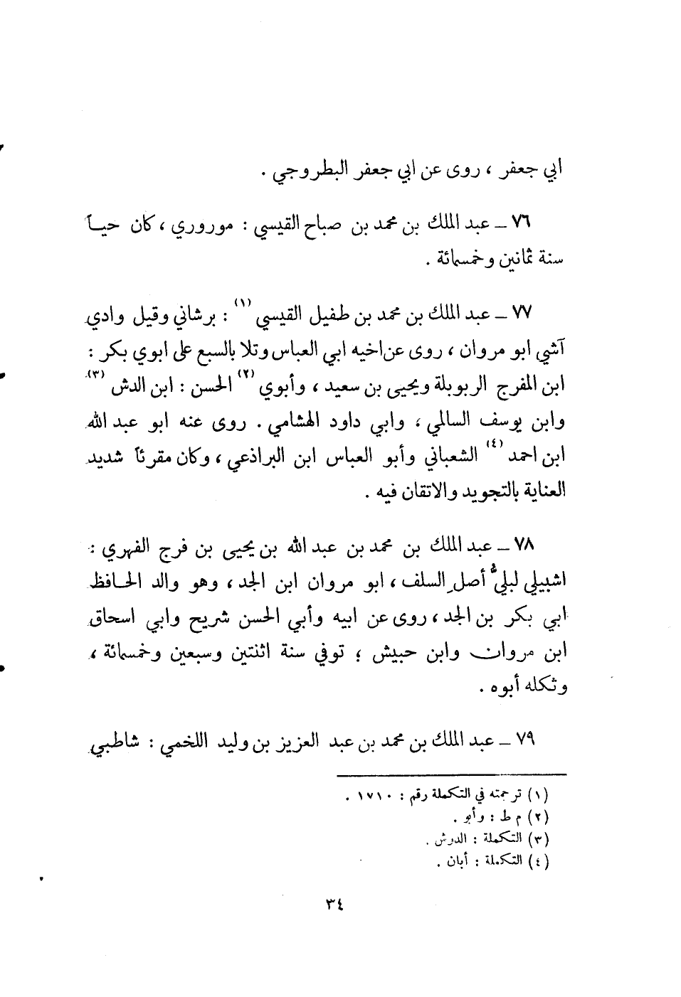 77 - عبد الملك بن محمد بن طفيل القيسي (1) : برشاني وقيل وادي آشي أبو مروان، روى عن أخيه أبي العباس وتلا بالسبع على ابوي بكر: ابن المفرج الربو بلة ويحيى بن سعيد، وابوي (2) الحسن: ابن الدش (3) وابن يوسف السالمي، وأبي داود الهشامي. روى عنه أبو عبد الله ابن أحمد (4) الشعباني وأبو العباس ابن البراذعي، وكان مقرئاً شديد العناية بالتجويد والإتقان فيه.