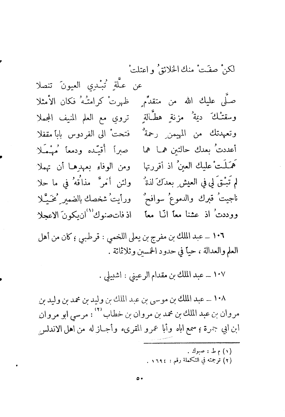ووددت إذ عشنا معاً أنا معاً ... إذ فات صنوك (1) أن يكون الاعجلا 106 - عبد الملك بن مفرج بن يعلى اللخمي: قرطبي؛ كان من اهل العلم والعدالة، حياً في حدود الخمسين وثلاثمائة.