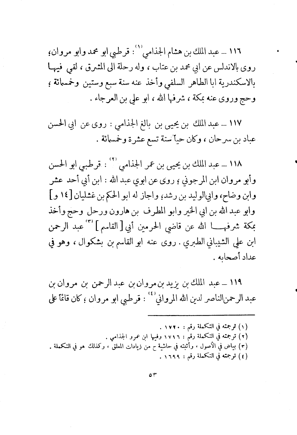 116 - عبد الملك بن هشام الجذامي (1) : قرطبي أبو محمد وأبو مروان؛ روى بالأندلس عن أبي محمد بن عتاب، وله رحلة إلى المشرق، لقي فيها بالإسكندرية ابا الطاهر السلفي واخذ عنه سنة سبع وستين وخمسمائة؛ وحج وروى عنه بمكة، شرفها الله، أبو علي بن العرجاء.