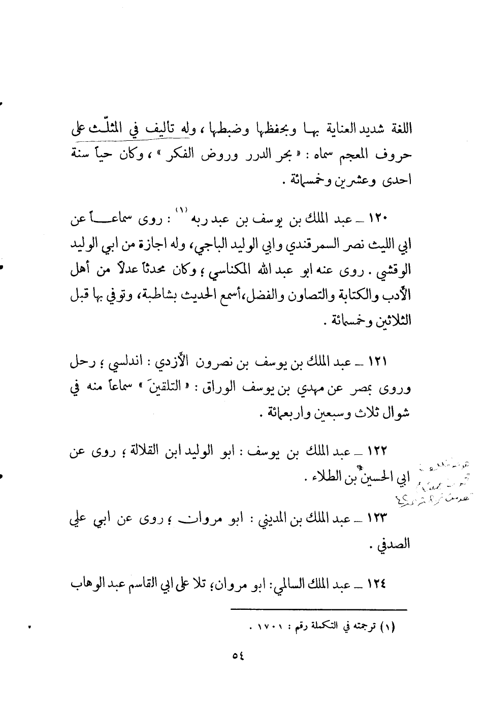 120 - عبد الملك بن يوسف بن عبد ربه (1) : روى سماعاً عن أبي الليث نصر السمرقندي وأبي الوليد الباجي، وله إجازة من أبي الوليد الوقشي. روى عنه أبو عبد الله المكناسي؛ وكان محدثاً عدلاً من أهل الادب والكتابة والتصاون والفضل، أسمع الحديث بشاطبة، وتوفي بها قبل الثلاثين وخمسمائة.