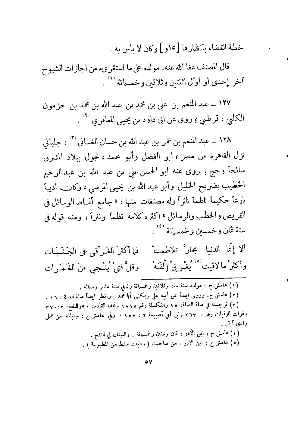 128 - عبد المنعم بن عمر بن عبد الله بن حسان الغساني (3) : جلياني نزل القاهرة من مصر، أبو الفضل وأبو محمد، تجول ببلاد المشرق سائحاً وحج؛ روى عنه أبو الحسن علي بن عبد الله بن عبد الرحيم الخطيب بضريح الخليل وأبو عبد الله بن يحيى المرسي، وكان أديباً بارعاً حكيماً ناظماً ناثراً وله مصنفات منها: " جامع أنماط الوسائل في القريض والخطب والرسائل " أكثره كلامه نظماً ونثراً، ومنه قوله في سنة ثمان وخمسين وخمسمائة (4) :