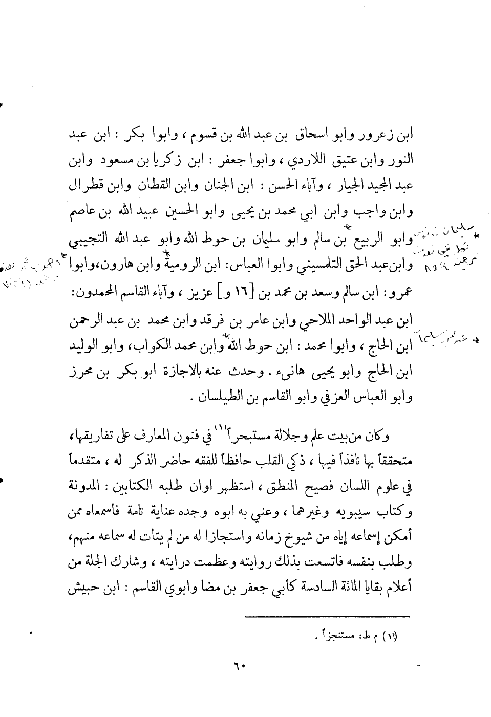 ابن زعرور وأبو اسحاق بن عبد الله بن قسوم، وأبوا بكر: ابن عبد النور وابن عتيق اللاردي، وأبوا جعفر: ابن زكريا بن مسعود وابن عبد المجيد الجيار، وآباء الحسن: ابن الجنان وابن القطان وابن قطرال وابن واجب وابن أبي محمد بن يحيى وأبو الحسين عبيد الله بن عاصم وأبو الربيع بن سالم وأبو سليمان بن حوط الله وأبو عبد الله التجيبي وابن عبد الحق التلمسيني وأبوا العباس: ابن الرومية وابن هارون، وأبوا عمرو: ابن سالم وسعد بن محمد بن [16 و] عزيز، وآباء القاسم المحمدون: ابن عبد الواحد الملاحي وابن عامر بن فرقد وابن محمد بن عبد الرحمن ابن الحاج، وأبوا محمد: ابن حوط الله وابن محمد الكواب، وابو الوليد ابن الحاج وأبو يحيى هانئ. وحدث عنه بالإجازة أبو بكر بن محرز وأبو العباس العزفي وأبو القاسم بن الطيلسان. وكان من بيت علم وجلالة مستبحراً (1) في فنون المعارف على تفاريقها، متحققاً بها نافذاً فيها، ذكي القلب حافظاً للفقه حاضر الذكر له، متقدماً في علوم اللسان فصيح المنطق، استظهر اوان طلبه الكتابين: المدونة وكتاب سيبويه وغيرهما، وعني به ابوه وجده عناية تامة فاسمعاه ممن أمكن إسماعه إياه من شيوخ زمانه واستجازا له من لم يتأت له سماعه منهم، وطلب بنفسه فاتسعت بذلك روايته وعظمت درايته، وشارك الجلة من اعلام بقايا المائة السادسة كأبي جعفر بن مضا وابوي القاسم: ابن حبيش