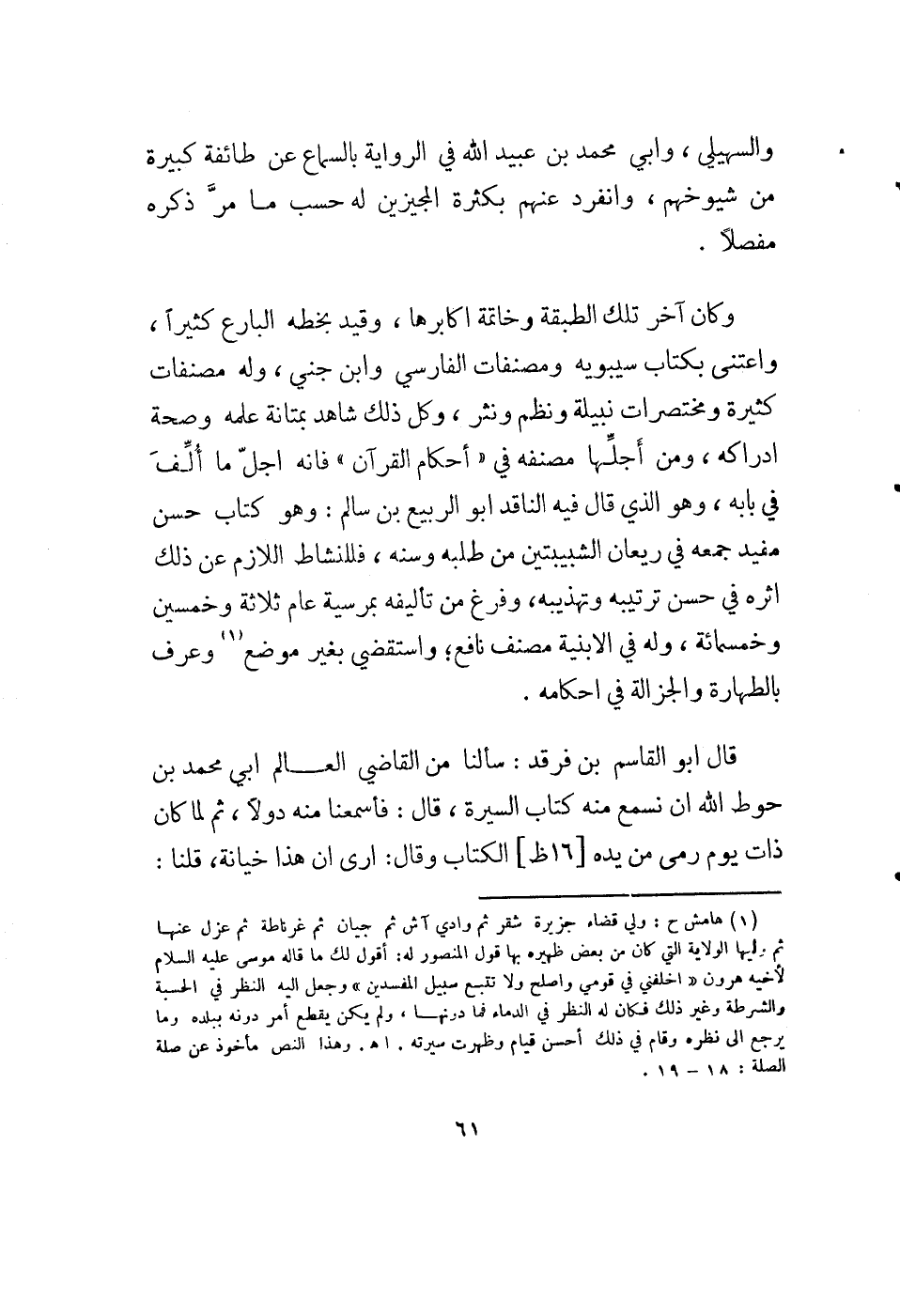 (1) هامش ح: ولي قضاء جزيرة شقر ثم وادي آش ثم جيان ثم غرناطة ثم عزل عنها ثم وليها الولاية التي كان من بعض ظهيره بها قول المنصور له: أقول لك ما قاله موسى عليه السلام لأخيه هرون " اخلفني في قومي واصلح ولا تتبع سبيل المفسدين " وجعل إليه النظر في الحسبة والشرطة وغير ذلك فكان له النظر في الدماء فما دونها، ولم يكن يقطع أمر دونه ببلده وما يرجع إلى نظره وقام في ذلك أحسن قيام وظهرت سيرته. أهـ. وهذا النص مأخوذ عن صلة الصلة: 18: 19.