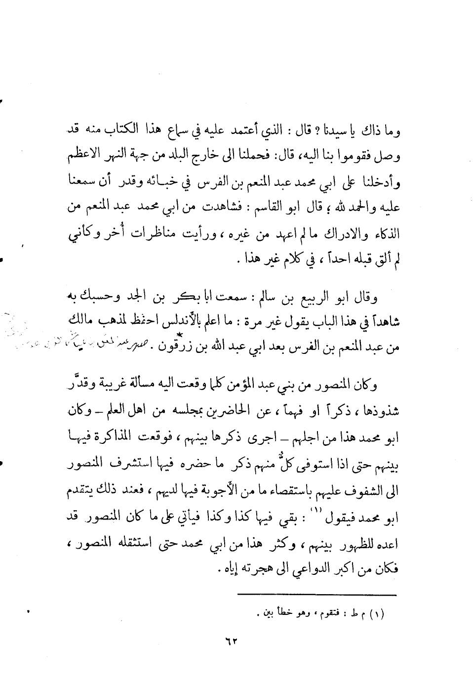 وكان المنصور من بني عبد المؤمن كلما وقعت إليه مسألة غريبة وقدر شذوذها، ذكراً أو فهماً، عن الحاضرين بمجلسه من أهل العلم - وكان أبو محمد هذا من أجلهم - أجرى ذكرها بينهم، فوقعت المذاكرة فيها بينهم حتى إذا استوفى كل منهم ذكر ما حضره فيها استشرف المنصور إلى الشفوف عليهم باستقصاء ما من الأجوبة فيها لديهم، فعند ذلك يتقدم أو محمد فيقول (1) : بقي فيها كذا وكذا فيأتي على ما كان المنصور قد أعده للظهور بينهم، وكثر هذا من أبي محمد حتى استثقله المنصور، فكان من أكبر الدواعي إلى هجرته إياه.