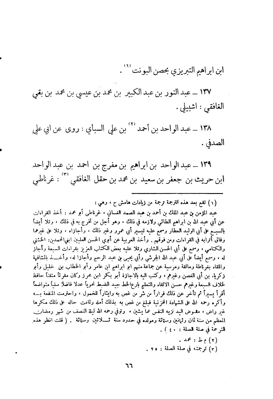 137 - عبد النور بن عبد الكبير بن محمد بن عيسي بن محمد بن بقي الغافقي: اشبيلي.