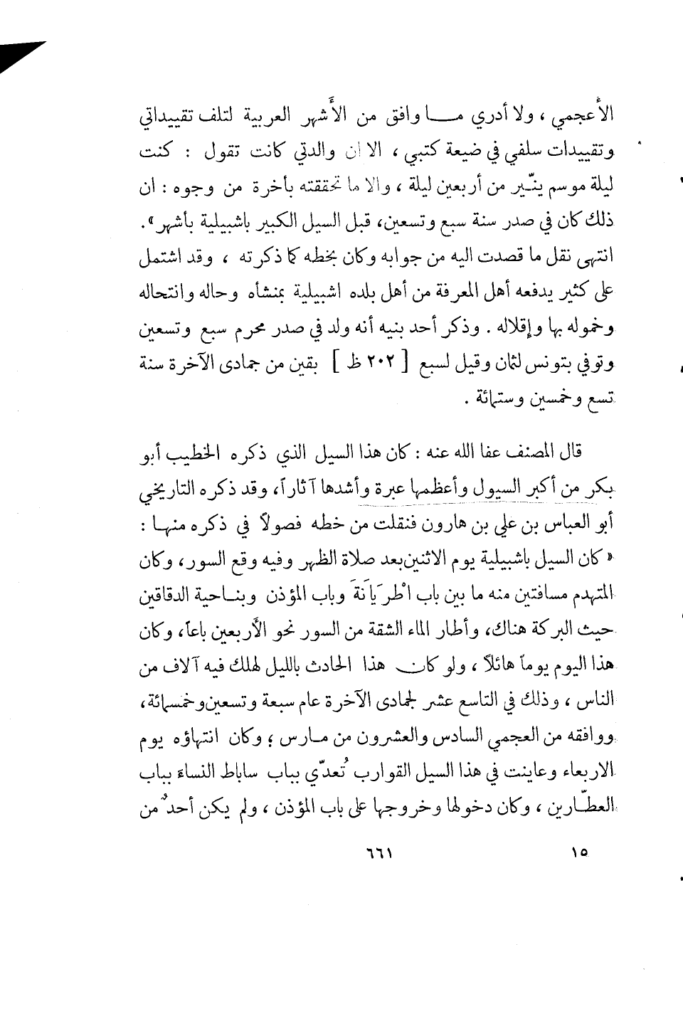 قال المصنف عفا الله عنه: كان هذا السيل الذي ذكره الخطيب أبو بكر من اكبر السيول وأعظمها عبرة وأشدها آثاراً، وقد ذكره التاريخي أبو العباس بن علي بن هارون فنقلت من خطه فصولاً في ذكره منها: " كان السيل بإشبيلية يوم الاثنين بعد صلاة الظهر وفيه وقع السور، وكان المتهدم مسافتين منه ما بين باب اطريانة وباب المؤذن وبناحية الدقاقين حيث البركة هنالك، وأطار الماء الشقة من السور نحو الأربعين باعاً، وكان هذا اليوم يوماً هائلاً، ولو كان هذا الحادث بالليل لهلك فيه آلاف من الناس، وذلك في التاسع عشر لجمادى الآخرة عام سبعة وتسعين وخمسمائة، ووافقه من العجمي السادس والعشرين من مارس؛ وكان انتهاؤه يوم الأربعاء وعاينت في هذا السيل القوارب تعدي بباب ساباط النساء بباب العطارين، وكان دخولها وخروجها على باب المؤذن، ولم يكن أحد من