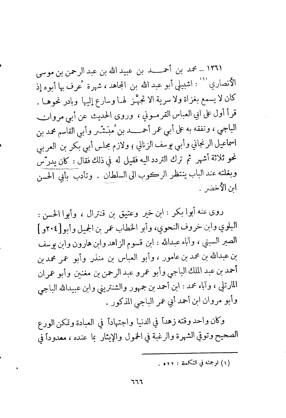 1261 - محمد بن أحمد بن عبيد الله بن عبد الرحمن بن موسى الأنصاري (1) : إشبيلي أبو عبد الله بن المجاهد، شهرة عرف بها أبوه إذ كان لا يسمع بغزاة ولا سرية إلا تجهز لها وسارع إليها وبادر نحوها. قرا أول على أبي العباس القرموني، وروى الحديث عن أبي مروان ابلاجي، وتفقه به على أبي عمر أحمد بن مبشر وأبي القاسم محمد بن إسماعيل الرنجاني وأبي يوسف الزناتي؛ ولازم مجلس أبي بكر بن العربي نحو ثلاثة اشهر ثم ترك التردد غليه فقيل له في ذلك فقال: كان يدرس وبغلته عند الباب ينتظر الركوب إلى السلطان. وتأدب بابي الحسن ابن الأخضر.