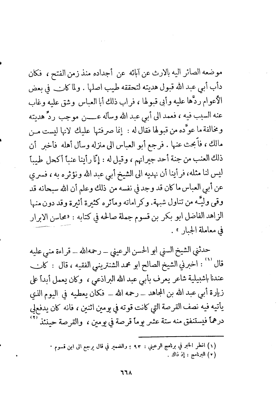 موضعه الصائر إليه بالإرث عن آبائه عن أجداده منذ زمن الفتح، فكان دأب أبي عبد الله قبول هديته لتحققه طيب أصلها. ولما كان في بعض الأعوام ردها عليه وأبى قبولها، فراب ذلك أبا العباس وشق عليه وغاب عنه السبب فيه، فعمد إلى أبي عبد الله وساه عن موجب رد هديته ومخالفة ما عوده من قبولها فقال له: إنما صرفتها عليك لأنها ليست من مالك، فابحث عنها. فرجع أبو العباس إلى منزله وسال أهله فأخبر أن ذلك العنب من جنة أحد جيرانهم، وقيل له: أنا رأينا عنباً أكحل طيباً ليس لنا مثله، فرأينا أن نهديه إلى الشيخ أبي عبد الله ونؤثره به، فسري عن أبي العباس ما كان قد وجد في نفسه من ذلك وعلم أن الله سبحانه قد وقى وليه من تناول شبهة. وكراماته ومآثره كثيرة أثيرة وقد دون منها الزاهد الفاضل أبو بكر بن قسوم جملة صالحه في كتابه: " محاسن الأبرار في معاملة الجبار ".