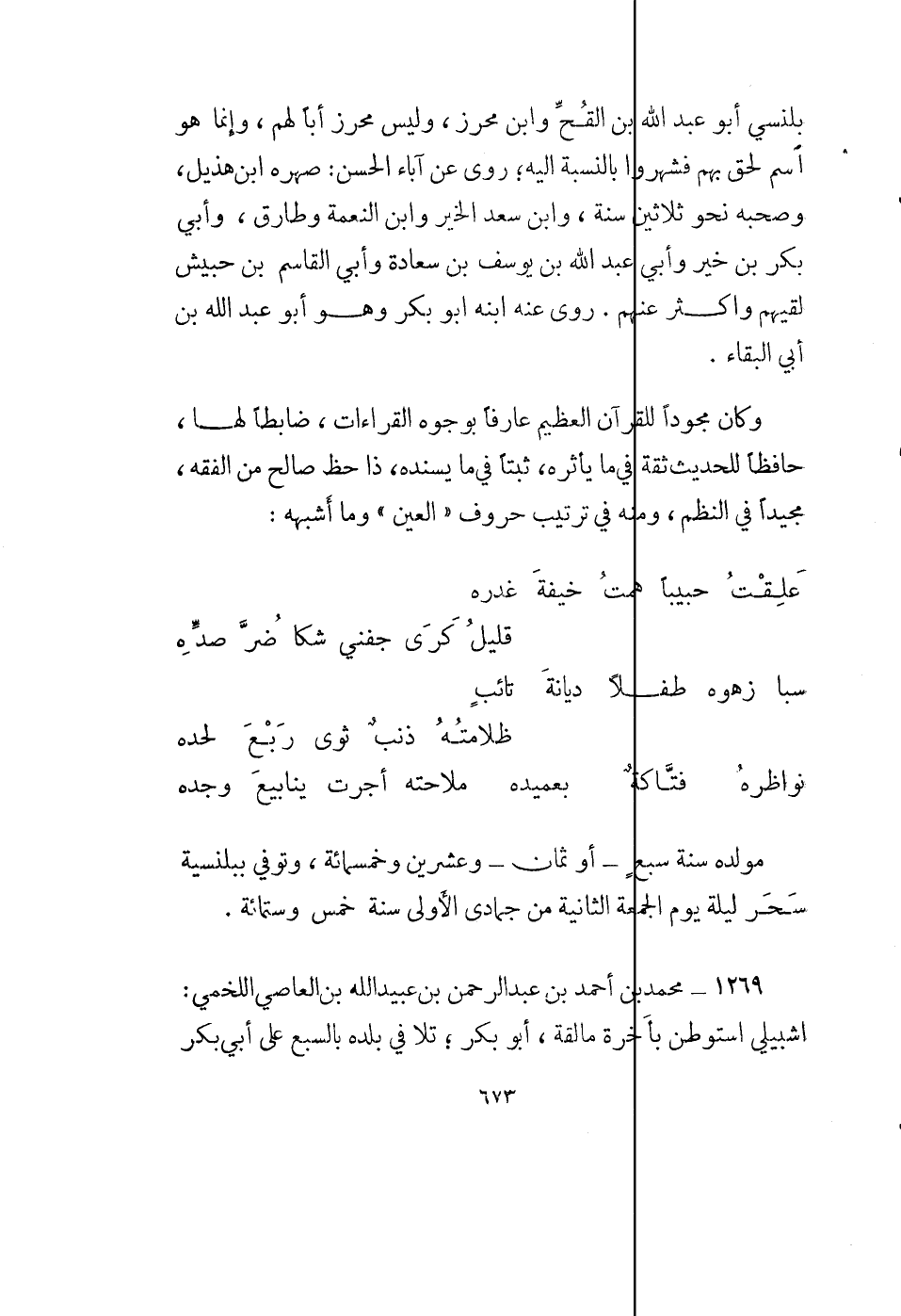 1269 - محمد بن احمد بن عبد الرحمن بن عبيد الله بن العاصي اللخمي: إشبيلي استوطن بأخرة مالقة، أبو بكر؛ تلا في بلده بالسبع على أبي بكر
