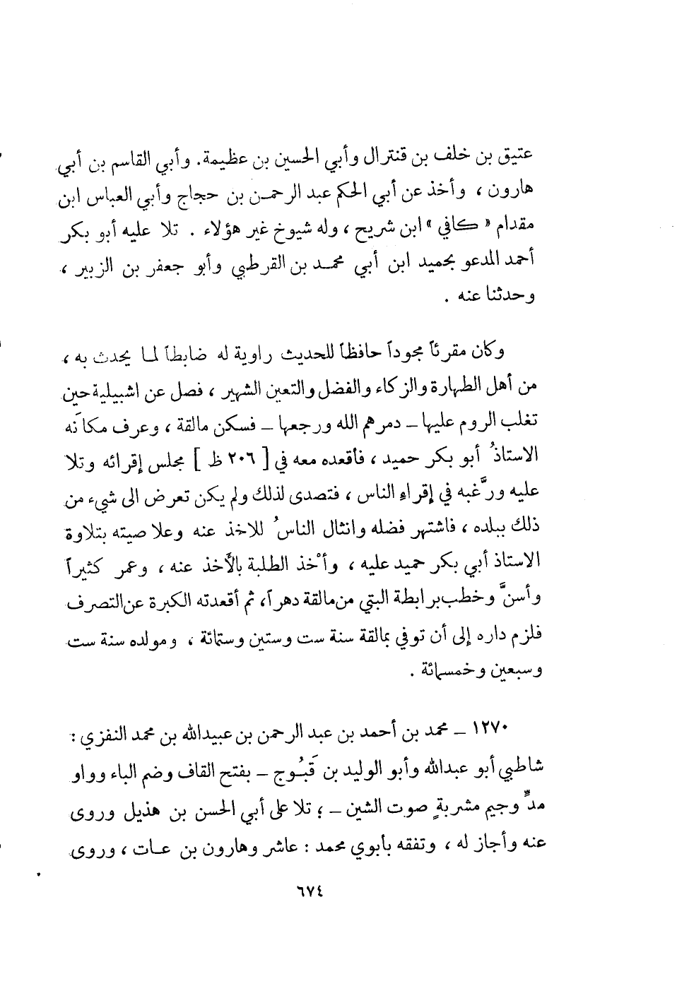 1270 - محمد بن احمد بن عبد الرحمن بن عبيد الله بن محمد النفزي: شاطبي أبو عبد الله وأبو الوليد بن قبوج - بفتح القاف وضم الباء وواو مد وجيم مشربة صوت الشين -؛ تلا على أبي الحسن بن هذيل وروى عنه وأجاز له، وتفقه بابوي محمد: عاشر وهارون بن عات، وروى