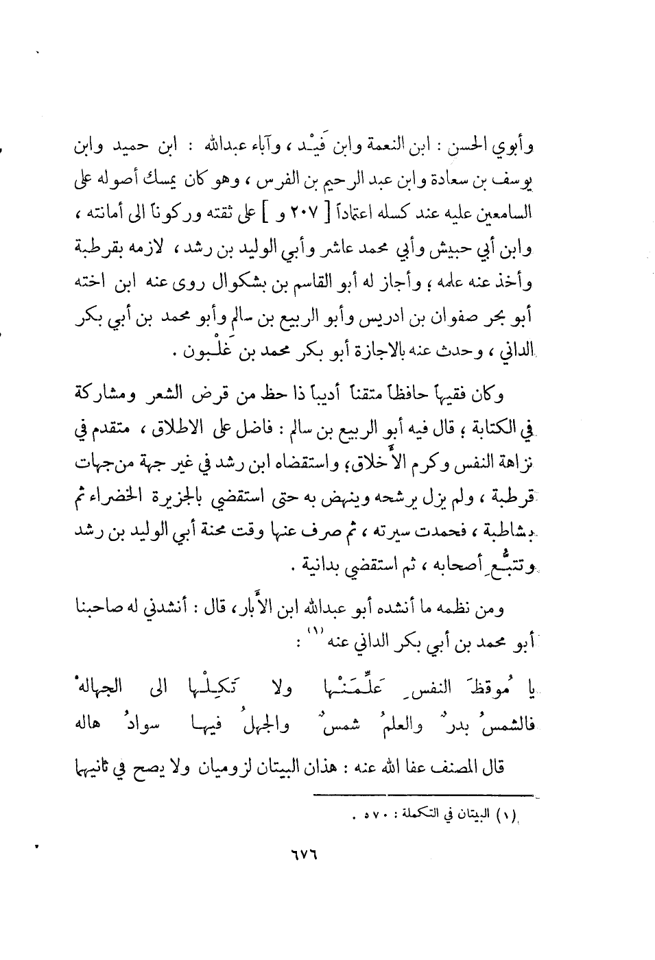 وأبوي الحسن: ابن النعمة وابن فيد، وآباء عبد الله: ابن حميد وابن يوسف بن سعادة وابن عبد الرحيم بن الفرس، وهو كان يمسك أصوله على السامعين عليه عند كسله اعتماداً [207 و] على ثقته وركوناً إلى أمانته، وابن أبي حبيش وأبي محمد عاشر وأبي الوليد بن رشد، لازمه بقرطبة وأخذ عنه علمه؛ وأجاز له أبو القاسم بن بشكوال روى عنه ابن أخته أبو بحر صفوان بن إدريس وأبو الربيع بن سالم وأبو محمد بن أبي بكر الداني، وحدث عنه بالإجازة أبو بكر محمد بن غلبون.