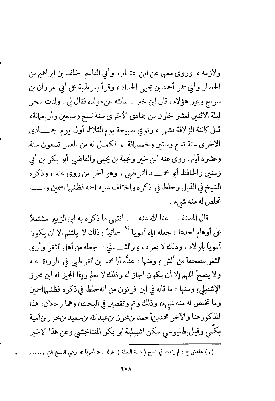 قال المصنف - عفا الله عنه -: انتهى ما ذكره به ابن الزبير مشتملاً على أوهام أحدها: جعله إياه أموياً (1) سماتياً وذلك لا يلتئم إلا ان يكون أموياً بالولاء، وذلك لا يعرف؛ والثاني: جعله من أهل الثغر وارى الثغر مصحفاً من ألش؛ ومنها: عده أبا محمد بن القرطبي في الرواة عنه ولا يصح اللهم إلا أن يكون أجاز له وذلك لا يعلم وإنما المجيز له ابن محرز الإشبيلي؛ ومنها: ما قاله في ابن فرتون من انه خلط في ذكره فظنهما اسمين وما تخلص له منه شيء، وذلك وهم وتقصير في البحث، وهما رجلان: هذا المذكور هنا والآخر محمد بن أحمد بن محرز بن عبد الله بن سعيد بن محرز بن أمية بكي وقيل بطليموس سكن إشبيلية أبو بكر المنتانجشي وعن هذا الأخير