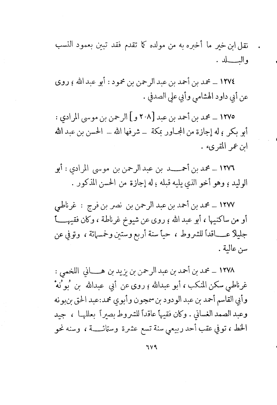 1277 - محمد بن أحمد بن عبد الرحمن بن نصر بن فرج: غرناطي أو من ساكنيها، أبو عبد الله؛ روى عن شيوخ غرناطة، وكان فقيهاً جليلاً عاقداً للشروط، حياً سنة أربع وستين وخمسمائة، وتوفي عن سن عالية.