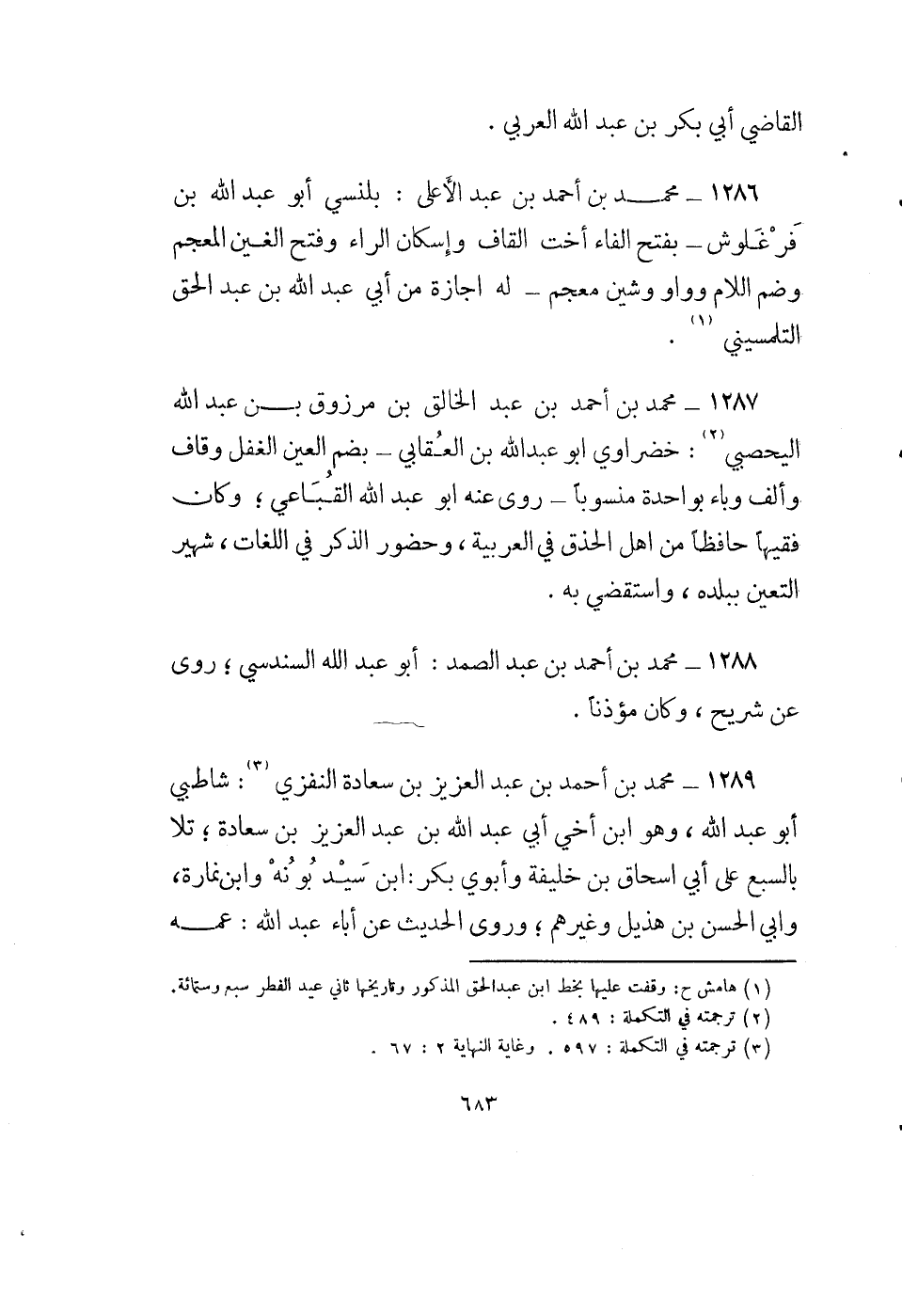 1286 - محمد بن أحمد بن عبد الأعلى: بلنسي أبو عبد الله بن فرغلوش - بفتح الفاء أخت القاف وإسكان الراء وفتح الغين المعجم وضم اللام وواو وشين معجم - له إجازة من أبي عبد الله بن عبد الحق التلمسيني (1) .