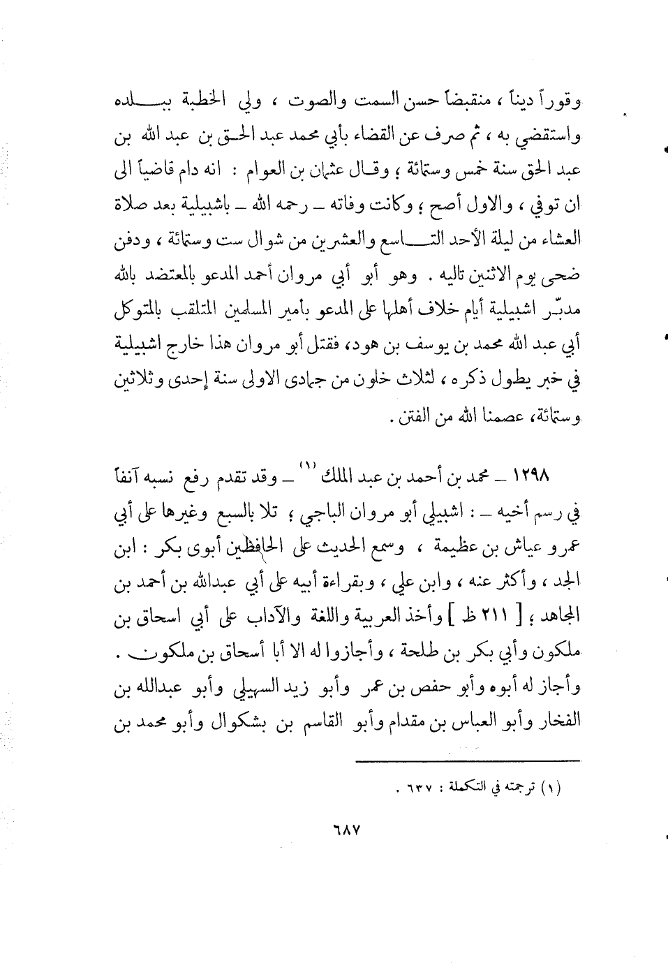 1298 - محمد بن أحمد بن عبد الملك (1) - وقد تقدم رفع نسبه آنفاً في رسم أخيه -: إشبيلي أبو مروان الباجي؛ تلا بالسبع وغيرها على أبي عمرو وعياش بن عظيمة، وسمع الحديث على الحافظين أبوي بكرك ابن الجد، واكثر عنه، وابن علي، وبقراءة أبيه على أبي عبد الله بن أحمد بن المجاهد؛ [211 ظ] وأخذ العربية واللغة والآداب على أبي إسحاق بن ملكون وأبي بكر بن طلحة، وأجازوا له إلا أبا إسحاق بن ملكون. وأجاز له أبوه وأبو حفص بن عمر وأبو زيد السهيلي وأبو عبد الله بن الفخار وأبو العباس بن مقدام وأبو القاسم بن بشكوال وأبو محمد بن