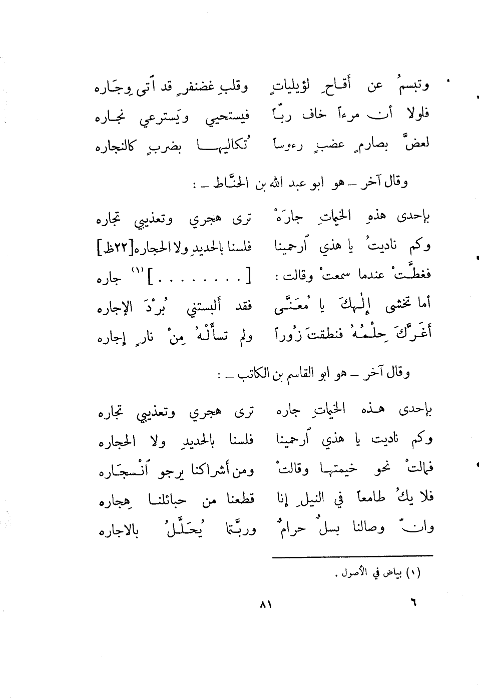 أغرك حلمه فنطقت زوراً ... ولم تسأله من نار إجاره وقال آخر - هو أبو القاسم بن الكاتب -:
