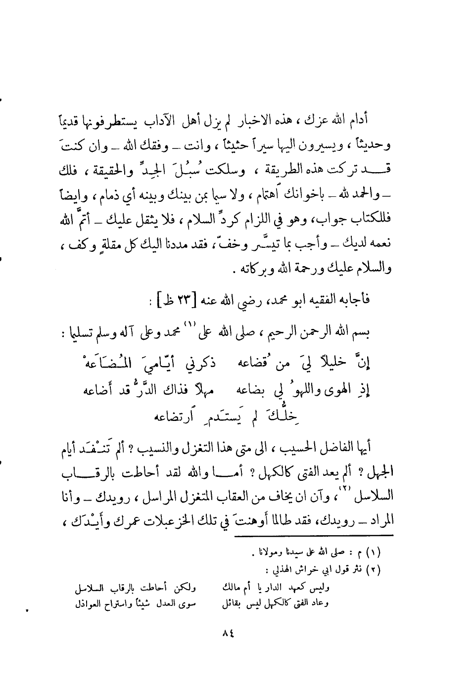 أدام الله عزك، هذه الأخبار لم يزل أهل الآداب يستطرفونها قديما وحديثا، ويسيرون إليها سيرا حثيثا، وأنت - وفقك الله - وإن كنت قد تركت هذه الطريقة، وسلكت سبل الجد والحقيقة، فلك - والحمد لله - بإخوانك اهتمام، ولا سيما بمن بينك وبينه أي ذمام، وأيضا فللكتاب جواب، وهو في اللزام كرد السلام، فلا يثقل عليك - أتم الله نعمه لديك - وأجب بما تيسر وخف، فقد مددنا إليك كل مقلة وكف، والسلام عليك ورحمة الله وبركاته.