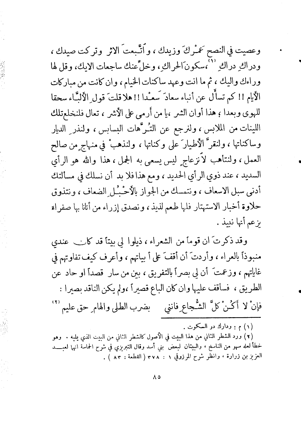 (2) ورد الشطر الثاني من هذا البيت في الأصول كالشطر الثاني من البيت الذي يليه، وهو خطأ لعله سهو من الناسخ، والبيتان لبعض بني أسد وقال التبريزي في شرح الحماسة إنهما لعبد العزيز بن زرارة، وأنظر شرح المرزوقي 1: 378 (القطعة: 83) .