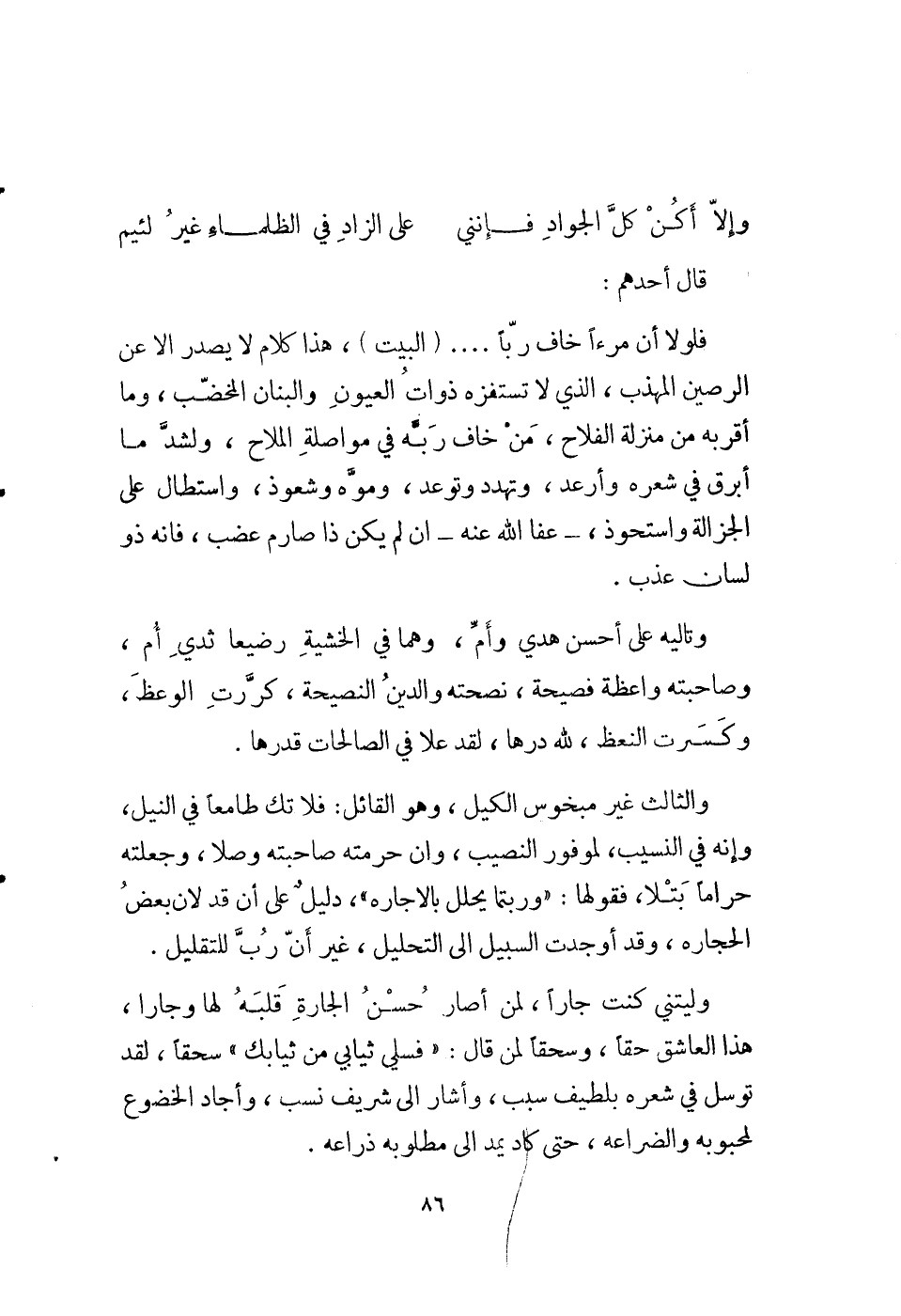 فلولا إن امرءا خاف ربا؟. (البيت) ، هذا كلام لا يصدر إلا عن الرصين المهذب، الذي لا تستفزه ذوات العيون والبنان المخضب، وما أقربه من منزلة الفلاح، من خاف ربه في مواصلة الملاح، ولشد ما أبرق في شعره وأرعد، وتهدد وتوعد، وموه وشعوذ، واستطال على الجزالة وأستحوذ، - عفا الله عنه - إن لم يكن ذا صارم عضب، فإنه ذو لسان عذب.