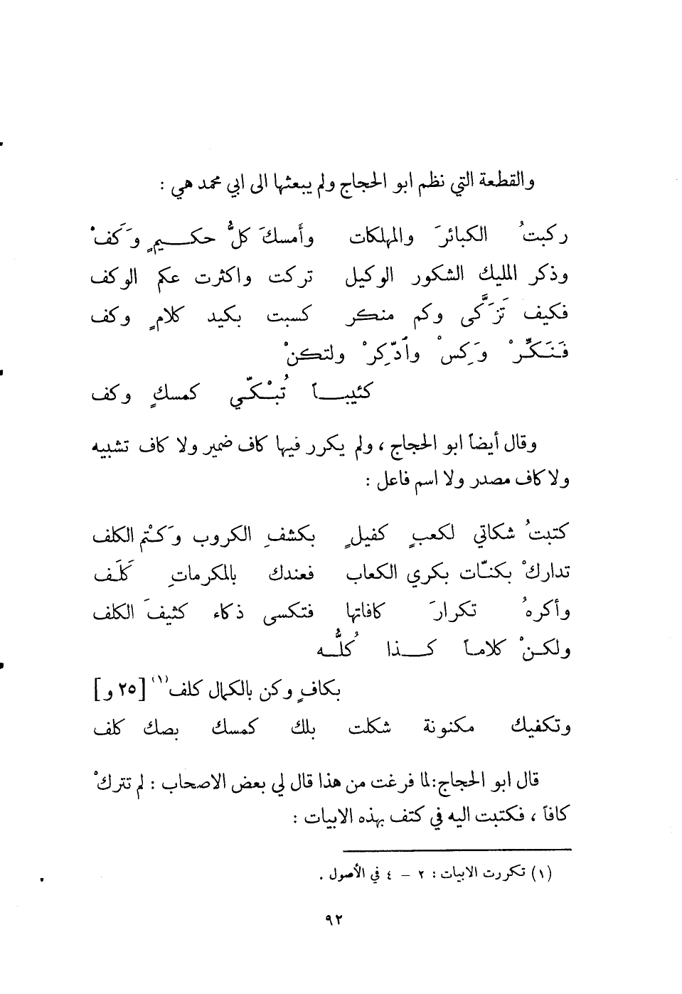 فنكر وكس وادكر ولتكن ... كئيباً تبكي كمسك وكف وقال أيضاً أبو الحجاج، ولم يكرر فيها كاف ضمير ولا كاف تشبيه ولا كاف مصدر ولا اسم فاعل: