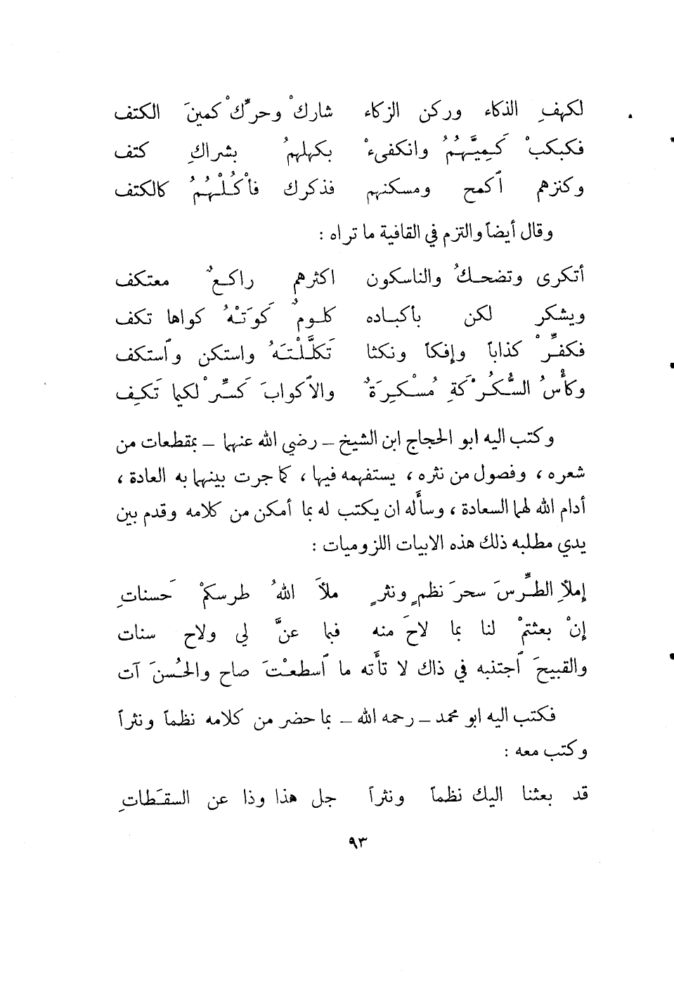 وكاس السكركة مسكرة ... والأكواب كسر لكيما تكف وكتب إليه أبو الحجاج ابن الشيخ - رضي الله عنهما - بمقطعات من شعره، وفصول من نثره، يستفهمه فيها، كما جرت بينهما به العادة، أدام الله لهما السعادة، وسأله أن يكتب له بما أمكن من كلامه وقدم بين يدي مطلبه ذلك هذه الأبيات اللزوميات: