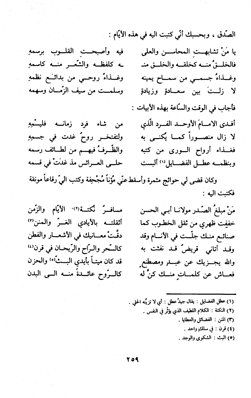 (من مبلغ الصَّدْر مَوْلَانَا أبي الْحسن ... مُسَافر نُكْتَة الْأَيَّام والزمن)