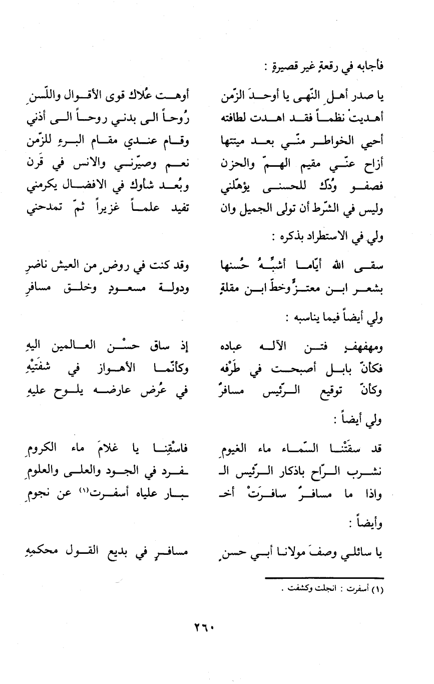(يَا سائلي وصف مَوْلَانَا أبي حسن ... مُسَافر فِي بديع القَوْل محكمه)