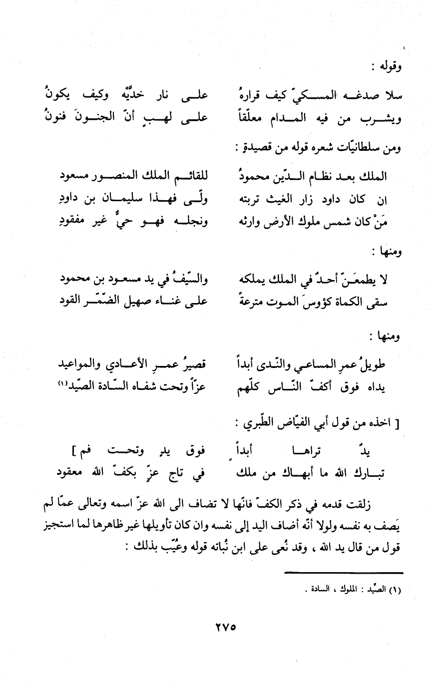 (يَدَاهُ فَوق أكف النَّاس كلهم ... عزا وَتَحْت شفَاه السَّادة الصَّيْد)