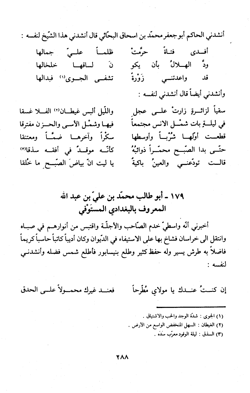 أَنْشدني الْحَاكِم أَبُو جَعْفَر مُحَمَّد بن إِسْحَاق البحاثي قَالَ أَنْشدني هَذَا الشَّيْخ لنَفسِهِ