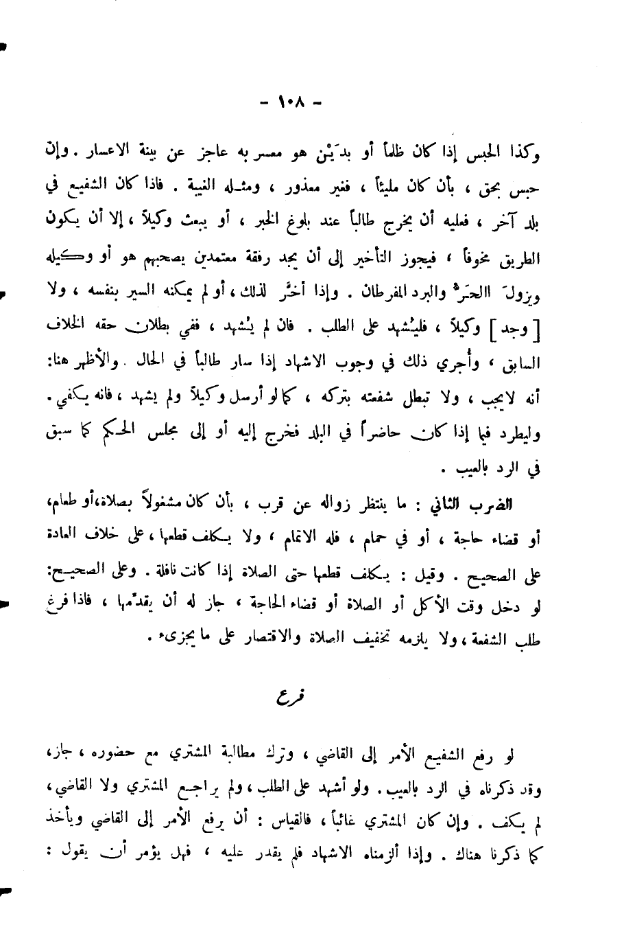 الضَّرْبُ الثَّانِي: مَا يُنْتَظَرُ زَوَالُهُ عَنْ قُرْبٍ، بِأَنْ كَانَ مَشْغُولًا بِصَلَاةٍ، أَوْ طَعَامٍ، أَوْ قَضَاءِ حَاجَةٍ، أَوْ فِي حَمَّامٍ، فَلَهُ الْإِتْمَامُ، وَلَا يُكَلَّفُ قَطْعَهَا، عَلَى خِلَافِ الْعَادَةِ عَلَى الصَّحِيحِ. وَقِيلَ: يُكَلَّفُ قَطْعَهَا حَتَّى الصَّلَاةَ إِذَا كَانَتْ نَافِلَةً. وَعَلَى الصَّحِيحِ: لَوْ دَخَلَ وَقْتُ الْأَكْلِ أَوِ الصَّلَاةِ أَوْ قَضَاءِ الْحَاجَةِ، جَازَ لَهُ أَنْ يُقَدِّمَهَا، فَإِذَا فَرَغَ طَلَبَ الشُّفْعَةَ، وَلَا يَلْزَمُهُ تَخْفِيفُ الصَّلَاةِ وَالِاقْتِصَارُ عَلَى مَا يُجْزِئُ.