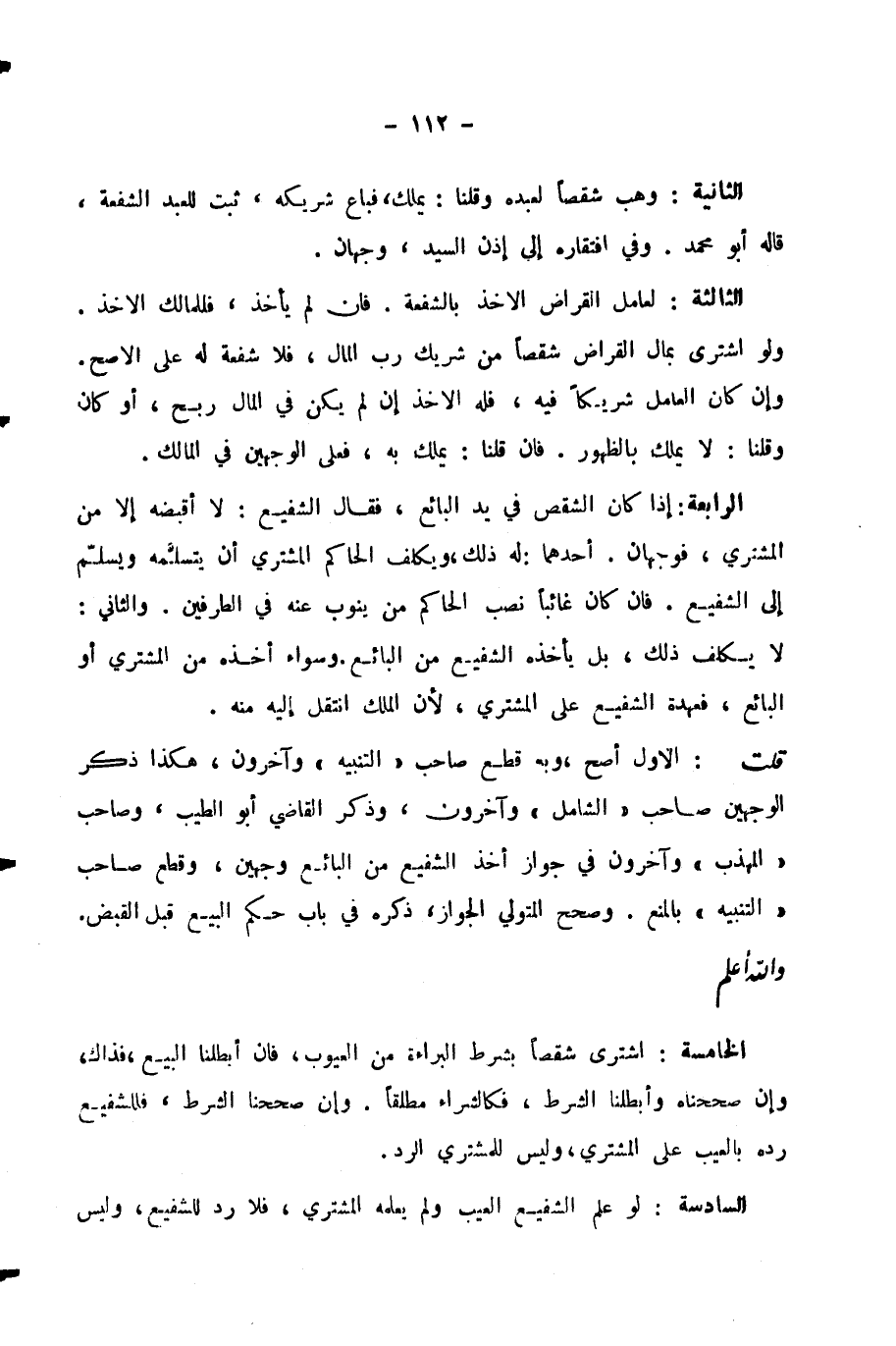 الْخَامِسَةُ: اشْتَرَى شِقْصًا بِشَرْطِ الْبَرَاءَةِ مِنَ الْعُيُوبِ، فَإِنْ أَبْطَلْنَا الْبَيْعَ، فَذَاكَ، وَإِنْ صَحَّحْنَاهُ وَأَبْطَلْنَا الشَّرْطَ، فَكَالشِّرَاءِ مُطْلَقًا. وَإِنْ صَحَّحْنَا الشَّرْطَ، فَلِلشَّفِيعِ رَدُّهُ بِالْعَيْبِ عَلَى الْمُشْتَرِي، وَلَيْسَ لِلْمُشْتَرِي الرَّدُّ.