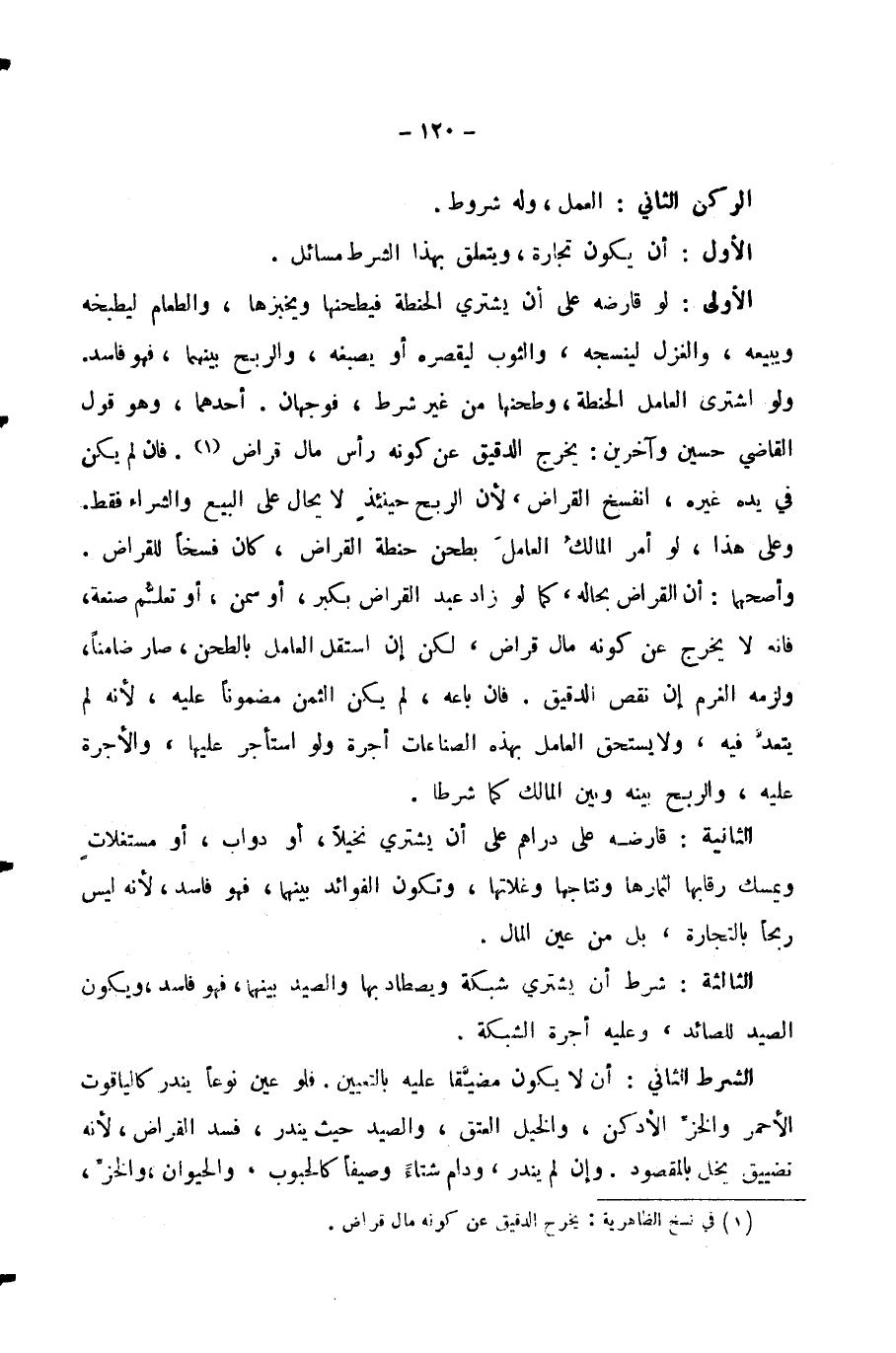 الْأُولَى: لَوْ قَارَضَهُ عَلَى أَنْ يَشْتَرِيَ الْحِنْطَةَ فَيَطْحَنَهَا وَيَخْبِزَهَا، وَالطَّعَامَ لِيَطْبُخَهُ وَيَبِيعَهُ، وَالْغَزْلَ لِيَنْسِجَهُ، وَالثَّوْبَ لِيُقَصِّرَهُ، أَوْ يَصْبِغَهُ، وَالرِّبْحُ بَيْنَهُمَا، فَهُوَ فَاسِدٌ. وَلَوِ اشْتَرَى الْعَامِلُ الْحِنْطَةَ، وَطَحَنَهَا مِنْ غَيْرِ شَرْطٍ، فَوَجْهَانِ. أَحَدُهُمَا، وَهُوَ قَوْلُ الْقَاضِي حُسَيْنٍ وَآخَرِينَ: يَخْرُجُ الدَّقِيقُ عَنْ كَوْنِهِ رَأْسَ مَالِ قِرَاضٍ. فَإِنْ لَمْ يَكُنْ فِي يَدِهِ غَيْرُهُ، انْفَسَخَ الْقِرَاضُ، لِأَنَّ الرِّبْحَ حِينَئِذٍ لَا يُحَالُ عَلَى الْبَيْعِ وَالشِّرَاءِ فَقَطْ. وَعَلَى هَذَا لَوْ أَمَرَ الْمَالِكُ الْعَامِلَ بِطَحْنِ حِنْطَةِ الْقِرَاضِ، كَانَ فَسْخًا لِلْقِرَاضِ. وَأَصَحُّهُمَا: أَنَّ الْقِرَاضَ بِحَالِهِ، كَمَا لَوْ زَادَ عَبْدُ الْقِرَاضِ بِكِبَرٍ، أَوْ سِمَنٍ، أَوْ تَعَلُّمِ صَنْعَةٍ، فَإِنَّهُ لَا يَخْرُجُ عَنْ كَوْنِهِ مَالَ قِرَاضٍ، لَكِنْ إِنِ اسْتَقَلَّ الْعَامِلُ بِالطَّحْنِ، صَارَ ضَامِنًا، وَلَزِمَهُ الْغُرْمُ إِنْ نَقَصَ الدَّقِيقُ. فَإِنْ بَاعَهُ، لَمْ يَكُنِ الثَّمَنُ مَضْمُونًا عَلَيْهِ، لِأَنَّهُ لَمْ يَتَعَدَّ فِيهِ، وَلَا يَسْتَحِقُّ الْعَامِلُ بِهَذِهِ الصِّنَاعَاتِ أُجْرَةً وَلَوِ اسْتَأْجَرَ عَلَيْهَا، وَالْأُجْرَةُ عَلَيْهِ، وَالرِّبْحُ بَيْنَهُ وَبَيْنَ الْمَالِكِ كَمَا شَرَطَا.