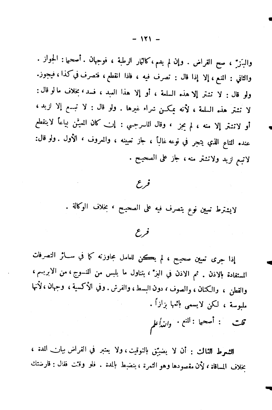 وَالْبَزِّ، صَحَّ الْقِرَاضُ. وَإِنْ لَمْ يَدُمْ، كَالثِّمَارِ الرَّطْبَةِ، فَوَجْهَانِ. أَصَحُّهُمَا: الْجَوَازُ، وَالثَّانِي: الْمَنْعُ، إِلَّا إِذَا قَالَ: تَصَرَّفْ فِيهِ، فَإِذَا انْقَطَعَ، فَتَصَرَّفْ فِي كَذَا، فَيَجُوزُ. وَلَوْ قَالَ: لَا تَشْتَرِ إِلَّا هَذِهِ السِّلْعَةَ، أَوْ إِلَّا هَذَا الْعَبْدَ، فَسَدَ، بِخِلَافِ مَا لَوْ قَالَ: لَا تَشْتَرِ هَذِهِ السِّلْعَةَ، لِأَنَّهُ يُمْكِنُ شِرَاءُ غَيْرِهَا. وَلَوْ قَالَ: لَا تَبِعْ إِلَّا لِزَيْدٍ، أَوْ لَا تَشْتَرِ إِلَّا مِنْهُ، لَمْ يَجُزْ، وَقَالَ الْمَاسَرْجِسِيُّ: إِنْ كَانَ الْمُعَيَّنُ بَيَّاعًا لَا يَنْقَطِعُ عِنْدَهُ الْمَتَاعُ الَّذِي يَتَّجِرُ فِي نَوْعِهِ غَالِبًا، جَازَ تَعْيِينُهُ، وَالْمَعْرُوفُ الْأَوَّلُ. وَلَوْ قَالَ: لَا تَبِعْ لِزَيْدٍ وَلَا تَشْتَرِ مِنْهُ. جَازَ عَلَى الصَّحِيحِ.