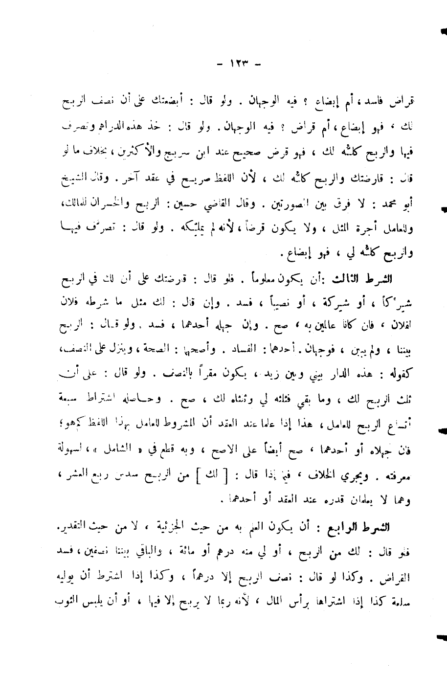 الشَّرْطُ الرَّابِعُ: أَنْ يَكُونَ الْعِلْمُ بِهِ مِنْ حَيْثُ الْجُزْئِيَّةُ، لَا مِنْ حَيْثُ التَّقْدِيرُ. فَلَوْ قَالَ: لَكَ مِنَ الرِّبْحِ، أَوْ لِي مِنْهُ دِرْهَمٌ أَوْ مِائَةٌ، وَالْبَاقِي بَيْنَنَا نِصْفَيْنِ، فَسَدَ الْقِرَاضُ. وَكَذَا لَوْ قَالَ: نِصْفُ الرِّبْحِ إِلَّا دِرْهَمًا، وَكَذَا إِذَا اشْتَرَطَ أَنْ يُوَلِّيَهُ سِلْعَةَ كَذَا إِذَا اشْتَرَاهَا بِرَأْسِ الْمَالِ، لِأَنَّهُ رُبَّمَا لَا يَرْبَحُ إِلَّا فِيهَا، أَوْ أَنْ يَلْبَسَ الثَّوْبَ