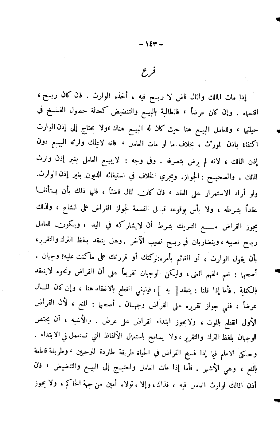 وَيَجْرِي الْخِلَافُ فِي اسْتِيفَائِهِ الدُّيُونَ بِغَيْرِ إِذْنِ الْوَارِثِ. وَلَوْ أَرَادَ الِاسْتِمْرَارَ عَلَى الْعَقْدِ، فَإِنْ كَانَ الْمَالُ نَاضًّا، فَلَهُمَا ذَلِكَ بِأَنْ يَسْتَأْنِفَا عَقْدًا بِشَرْطِهِ، وَلَا بَأْسَ بِوُقُوعِهِ قَبْلَ الْقِسْمَةِ لِجَوَازِ الْقِرَاضِ عَلَى الْمَشَاعِ، وَلِذَلِكَ يَجُوزُ الْقِرَاضُ مَعَ الشَّرِيكِ بِشَرْطِ أَنْ لَا يُشَارِكَهُ فِي الْيَدِ، وَيَكُونُ لِلْعَامِلِ رِبْحُ نَصِيبِهِ، وَيَتَضَارَبَانِ فِي رِبْحِ نَصِيبِ الْآخَرِ.
